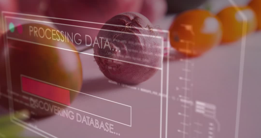 - Augmented Reality HUD Processing Produce Data with Progress Bar Over Beetroot and Tomatoes
