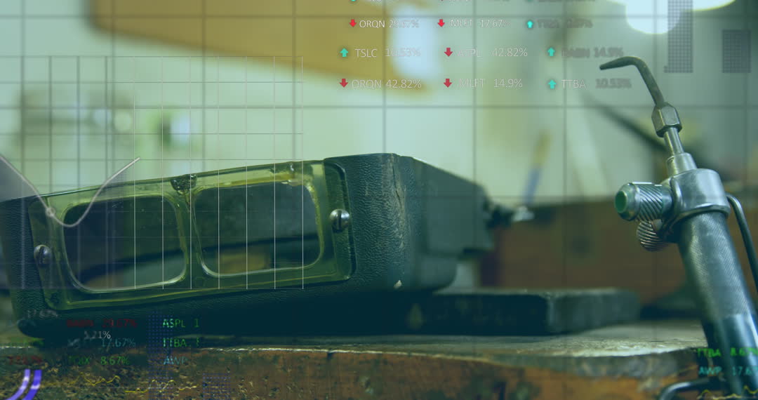 Shows integration of digital analytics in industrial settings, with welding glasses and data overlay indicating technological innovation. Useful for illustrating concepts in modern manufacturing methods, industry efficiency improvements, or the fusion of technology with traditional craftsmanship.