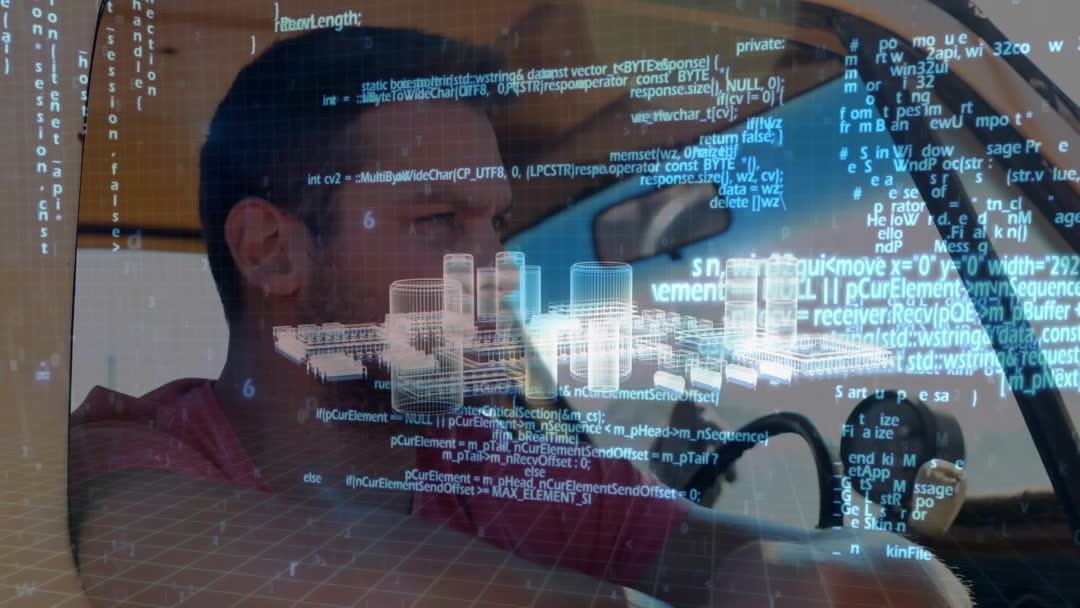 Animation showing a futuristic blend of augmented reality inside a car, illustrating advanced technology and digital connections. Useful for representing the intersection between transportation and technology, showcasing innovation in automobile industry, tech advancements in daily life, or demonstrating concepts of global connectivity and data movement.