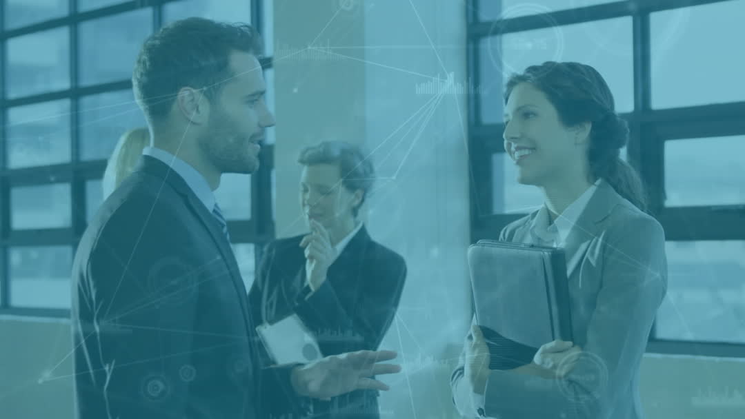 Dynamic presentation showing a group of businesspeople engaged in a meeting with digital data overlays, representing cutting-edge technology and cross-functional collaboration. Ideal for illustrating concepts of innovation, digital transformation, teamwork in global business settings, and the integration of technology in modern workspaces.