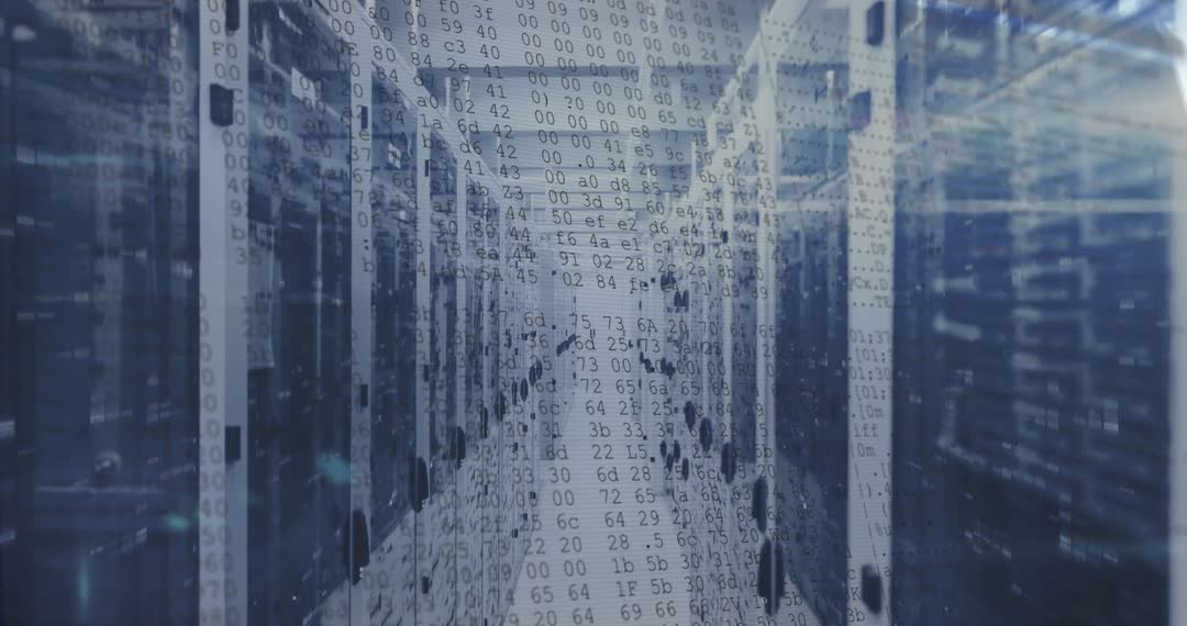 Visual illustration blending real-life server environment with a semi-transparent code overlay. Ideal for themes related to cybersecurity, server management, or advanced digital technology. Useful in presentations about IT infrastructure, data security strategies, or modern networking systems.