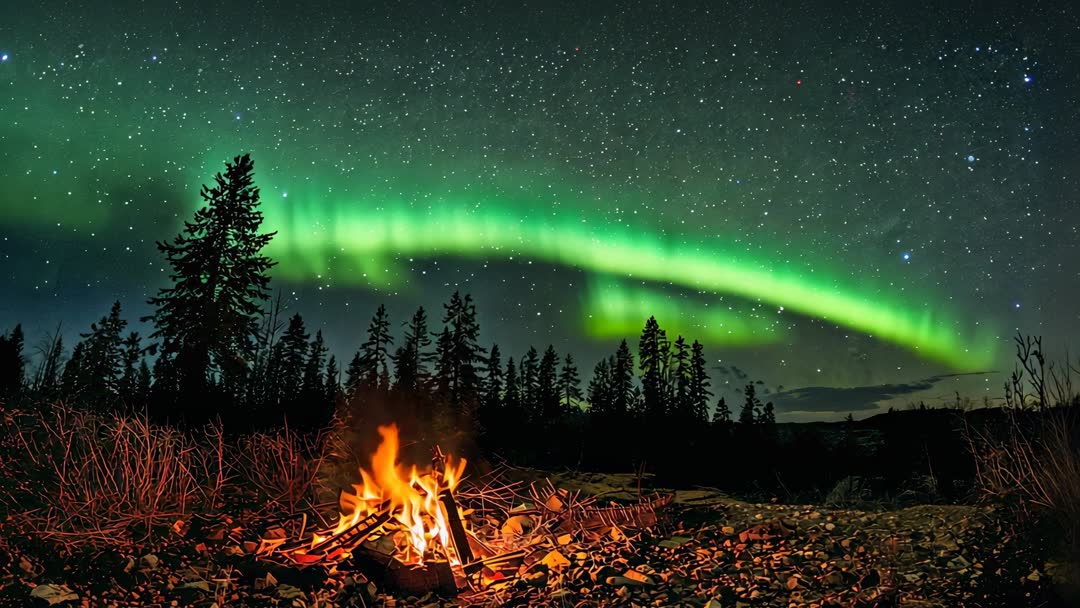 AI Generated Video. Featuring radiant green aurora arching across star-filled sky above pine silhouettes while campfire flickering in foreground, providing warm orange contrast to cool northern lights. Capturing nocturnal wilderness atmosphere, making clip ideal for travel films, outdoor adventure promos, tourism marketing, environmental documentaries, relaxation or meditation apps, music video backdrops, website hero footage, social media content. Working well for illustrating night photography techniques, aurora chasing guides, camping gear campaigns, seasonal winter promotions. Recommending usage: applying slow crossfade or gentle speed ramp to emphasize aurora motion, performing subtle color grading to boost aurora greens without clipping, looping 10-30 second segment for ambient background. Noting licensing suitability for commercial and editorial use, including broadcast and online streaming.