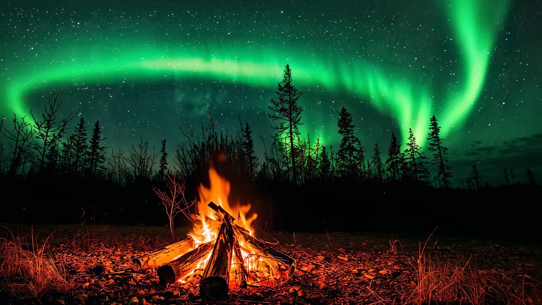 AI Generated Video. Video clip featuring Aurora Borealis dancing above pine silhouettes while campfire flickering over leaf litter. Foreground firelight creating warm contrast against cool green sky. Ideal for travel and adventure films, camping gear commercials, outdoor lifestyle promotions, relaxation and meditation videos, atmospheric opening sequences for documentaries, and social media reels. Clip pairing well with ambient soundtrack, slow pans, text overlays, and color grading to emphasize contrast between fire and aurora. Looping version suitable for background ambience on websites, digital signage, hotel lobbies, or desktop wallpaper loops. Serving well as hero footage for northern tourism campaigns, nature conservation presentations, editorial spreads about astronomy, or inspirational content about wilderness and solitude.
