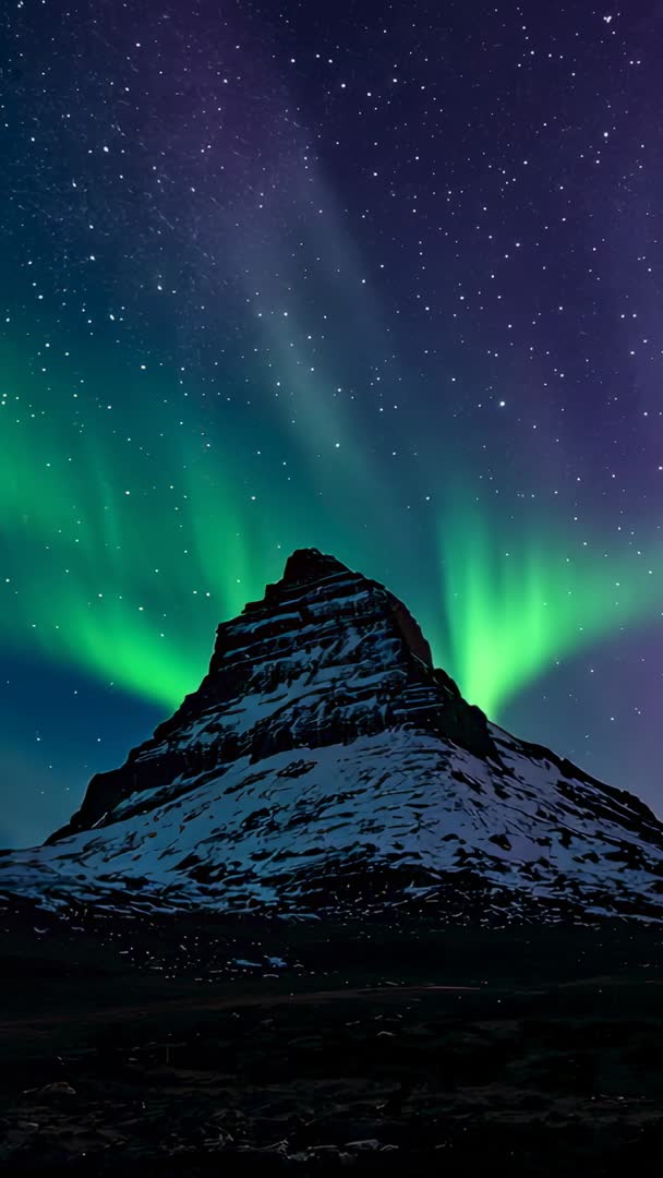 AI Generated Video. Footage showing emerald auroral ribbons rising behind snow-covered pyramid peak under star-filled sky. Shooting in vertical format for mobile platforms, optimized for reels and stories. Working well as opener for nature documentary, travel promo, environmental campaign, meditation video. Providing loop-friendly composition and strong silhouette for overlay text, logos, or titles. Color palette and contrast supporting dramatic headings, app splash screens, website hero panels, social feed thumbnails. Best for fullscreen vertical playback at 9:16 aspect ratio; consider adding gentle pan or subtle timelapse movement for cinematic effect.