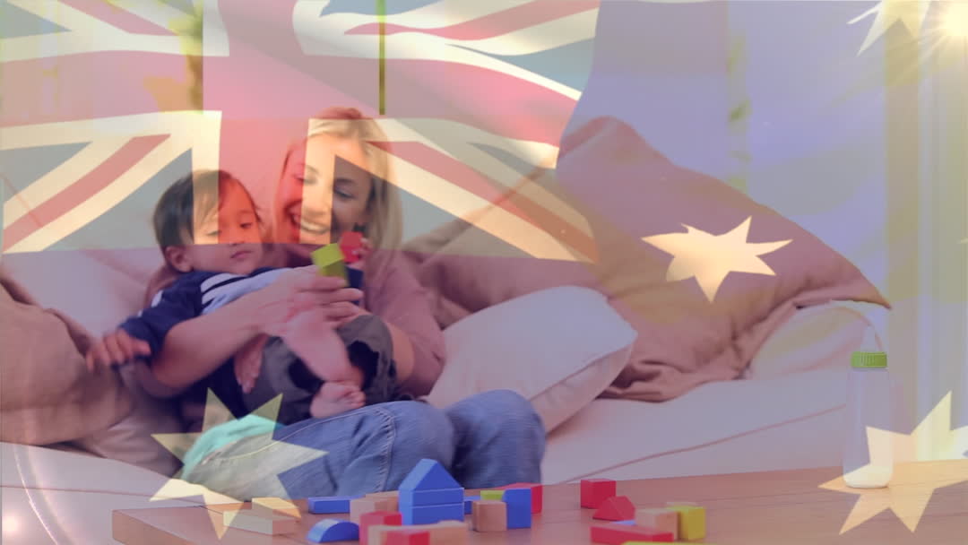 Australian Flag Overlay on Mother Playing with Child at Home Video