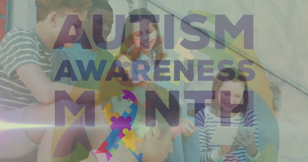 Multicolored animation displaying 'Autism Awareness Month' with engaged schoolchildren working together, symbolizing inclusion, diversity, and collaboration. Useful for promoting autism awareness events, educational campaigns, or community inclusion projects.