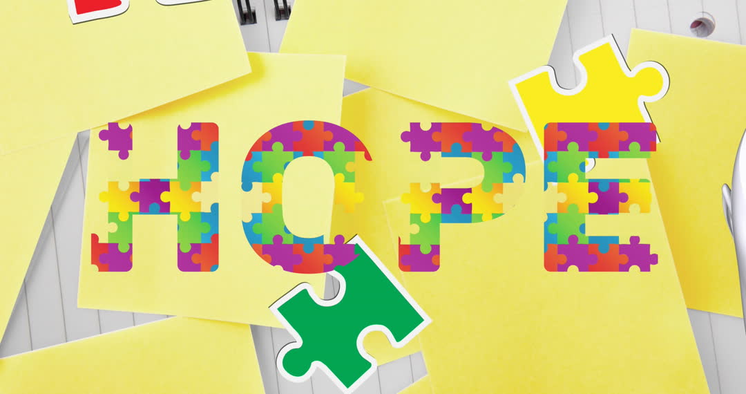 Illustration bold letters spelling 'HOPE' designed with vibrant, colorful puzzle pieces. Sticky notes lie underneath, supporting themes of autism awareness and spreading hope. Ideal for educational campaigns, presentations on inclusivity, diversity, or mental health, and awareness events surrounding autism support.