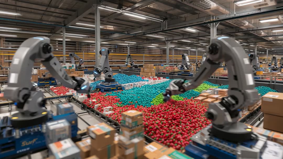 AI Generated Image. Video showing automated 6-axis robotic arms sorting multicolored spheres on high-speed conveyor inside large warehouse facility. Robotic grippers picking colored balls and placing into trays for packaging and order fulfillment. Conveyor moving, cardboard boxes lining pallets in background, overhead LED lighting illuminating workspace. Scene conveying modern logistics, scalable automation, precision pick-and-place operations, AI-driven inspection and machine vision guidance. Usage ideas: applying in technology presentations, manufacturing and industrial automation promos, e-commerce fulfillment demos, training modules for robotics technicians, editorial segments on Industry 4.0, investor pitch decks for robotics startups, website hero banners, social media short clips. Production tips: combining with animated overlays showing throughput and error rates, adding close-up cuts of gripper action for emphasis, including voiceover explaining control algorithms and quality checks, applying color grading to enhance contrast between colored spheres and metal arms. Ideal clip durations: lasting 5-12 seconds for establishing conveyor movement, lasting 8-20 seconds for action-focused sequences showing picking cycles.