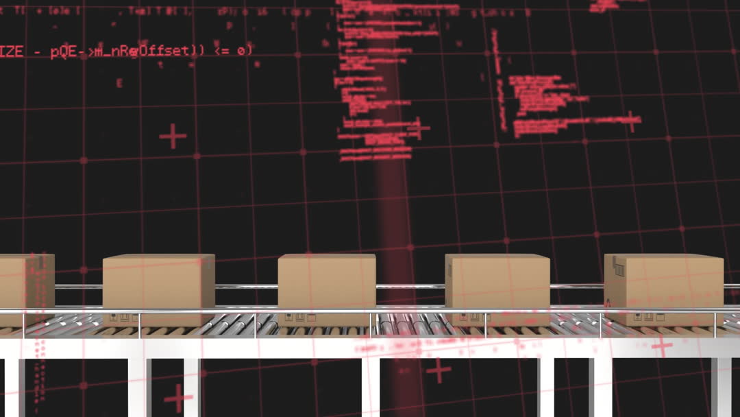 - Automated Conveyor with Cardboard Boxes and Digital Data Overlay