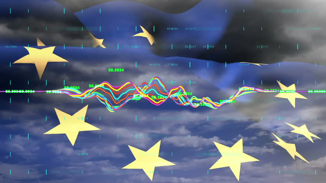 Concept blends the symbolism of the European Union with financial data analysis, indicating economic interaction and business potential. Use in contexts emphasizing global finance or advancements in data-driven economy associated with the EU. Suitable for presentations on market trends or innovations in finance technologies.