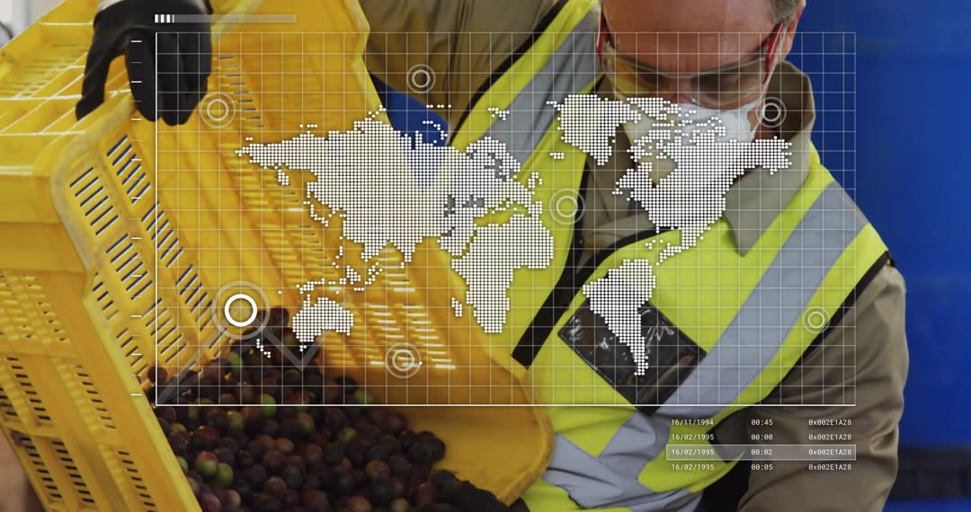 The video showcases a worker involved in food processing, interacting with a smart monitoring system. Modern technology like graphs and maps overlays track the logistics and manufacturing processes in real time. This visual can be used to illustrate the impact of technology on industrial automation, emphasize precision in food production logistics or highlight modern manufacturing techniques.