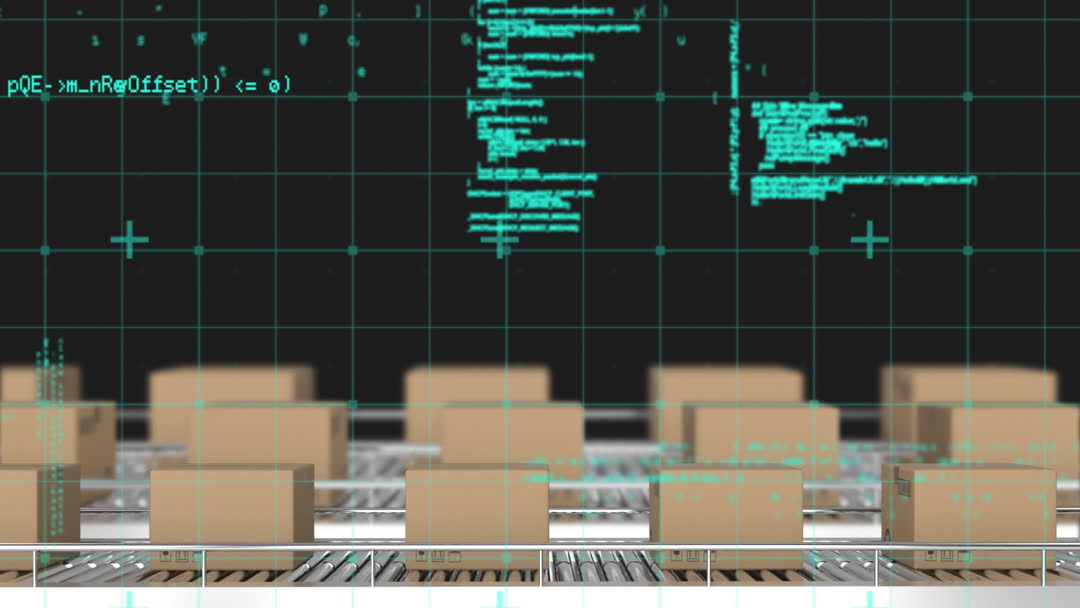 Visualizes integration of digital technology in global shipping logistics. Shows movement of packages on conveyor, indicative of an efficient automated delivery process. Including data analytics or programming script overlays highlights technology-driven enhancements in distribution centers. Useful for topics on smart warehousing, supply chain management, or showcasing innovative logistics technology in action.