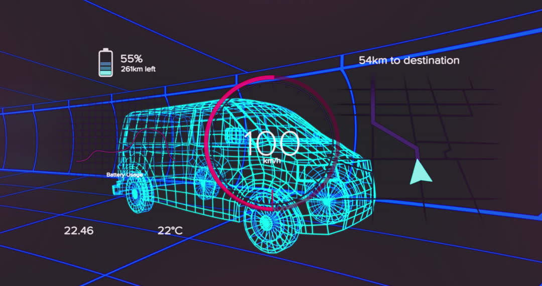 Futuristic animation depicting a 3D van model with overlaid digital data including speedometer, battery levels, and navigation details, set against a tunnel background. This concept can be used in presentations or promotions related to vehicle technology, engineering advancements, or transportation innovations.