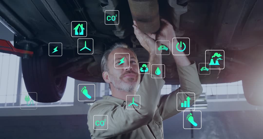 Automotive Mechanic Checking Vehicle Exhaust System with Environmental Icons Video