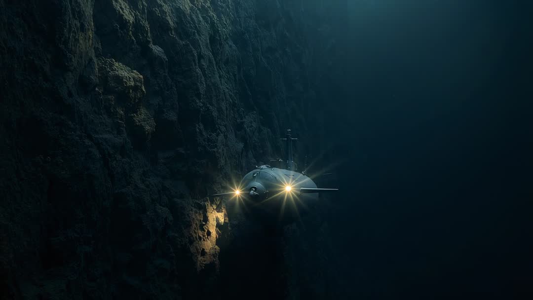 AI Generated Image. Showing autonomous submersible activating twin spotlights while navigating narrow abyssal canyon, illuminating textured rock crevices and revealing microhabitats. Dark, cinematic lighting and slow tracking movement creating suspenseful, immersive atmosphere ideal for dramatic storytelling. Use for documentary sequences, scientific survey reels, tech demos for marine robotics and AUV companies, training videos for ROV operators, environmental impact presentations, or sci-fi promo material. Edit-friendly composition leaving negative space for titles, lower thirds, logos, voiceover narration. Stock-ready clip serving marketing, educational content, cinematic trailers, UX showcases for underwater mapping software.