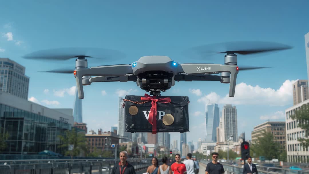 - Autonomous drone delivering VIP package over city bridge with pedestrians looking up