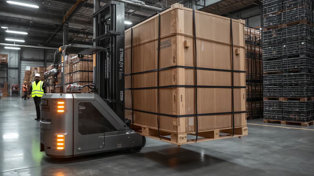 AI Generated Image. Video showing autonomous forklift transporting oversized wooden crate on pallet through modern warehouse, worker in high-visibility vest and hard hat guiding movement. Frame highlighting automated guided vehicle lifting strapped wooden crate amid stacked pallets and steel racking under industrial lighting, conveying warehouse automation and efficient logistics flow. Scene showcasing material handling, safety protocols, and robotics integration for supply chain operations. Suitable for corporate presentations, logistics and automation websites, industrial safety training, manufacturing or distribution center marketing, e-commerce fulfillment articles, and editorial coverage of supply chain technology. Works well as banner footage, background for explainer videos, training modules, and stock footage for news segments or investor decks.
