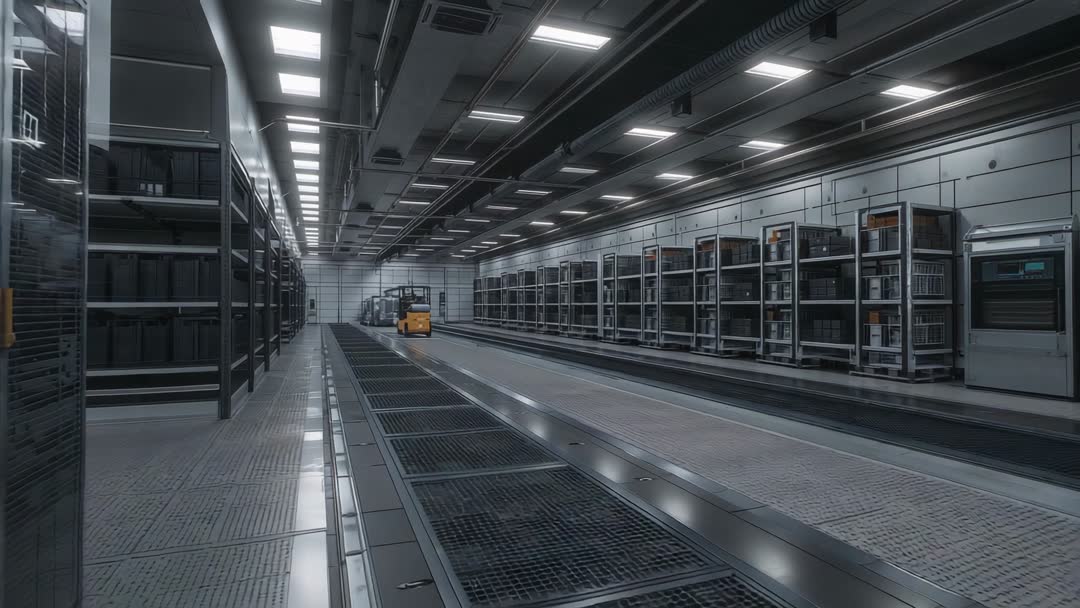 AI Generated Image. Video clip showing autonomous pallet truck navigating recessed track through high-tech warehouse aisle. Camera presenting low-angle, wide shot with strong leading lines and overhead LED lighting. Steel racks and stacked storage bins lining both sides while yellow pallet truck moving toward vanishing point. Footage conveying automated logistics, efficiency, and industrial scale operations. Use for corporate presentations, logistics and supply chain websites, automation product demos, training modules, and technology articles. Suggest using slow push-in edit or seamless loop of first 5 seconds for background animation. Recommend cool color grade, subtle vignette, and lower-third space for headline and logo. Ideal for 16:9 and 4K video projects focusing on smart warehouse, robotics, and material handling solutions.