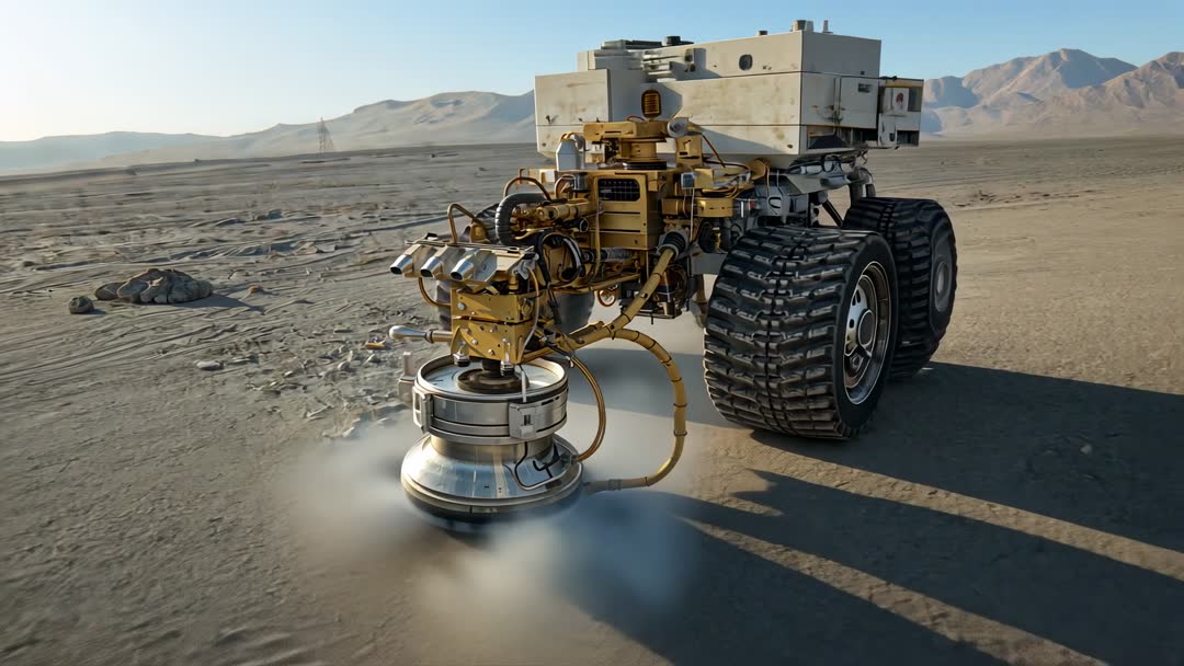 AI Generated Image. Video showing autonomous rover deploying rotating drill head into packed desert soil, spinning bell tool kicking up dust and creating surface disturbance. Camera tracking slow lateral approach while focusing on manipulator joints, wheeled chassis, and heavy-duty tires. Lighting highlighting metallic surfaces and shadow detail across arid plain and distant mountain range. Footage working well for technology demonstration, robotics product video, space mission concept, environmental survey presentation, engineering case study, and educational content about remote sensing and sample acquisition. Clip supporting website hero banners, conference reels, social media promos, explainer videos, and editorial features about automation and exploration. Metadata noting high visual detail, realistic dust simulation, and cinematic perspective for use in commercials, presentations, and documentary projects.