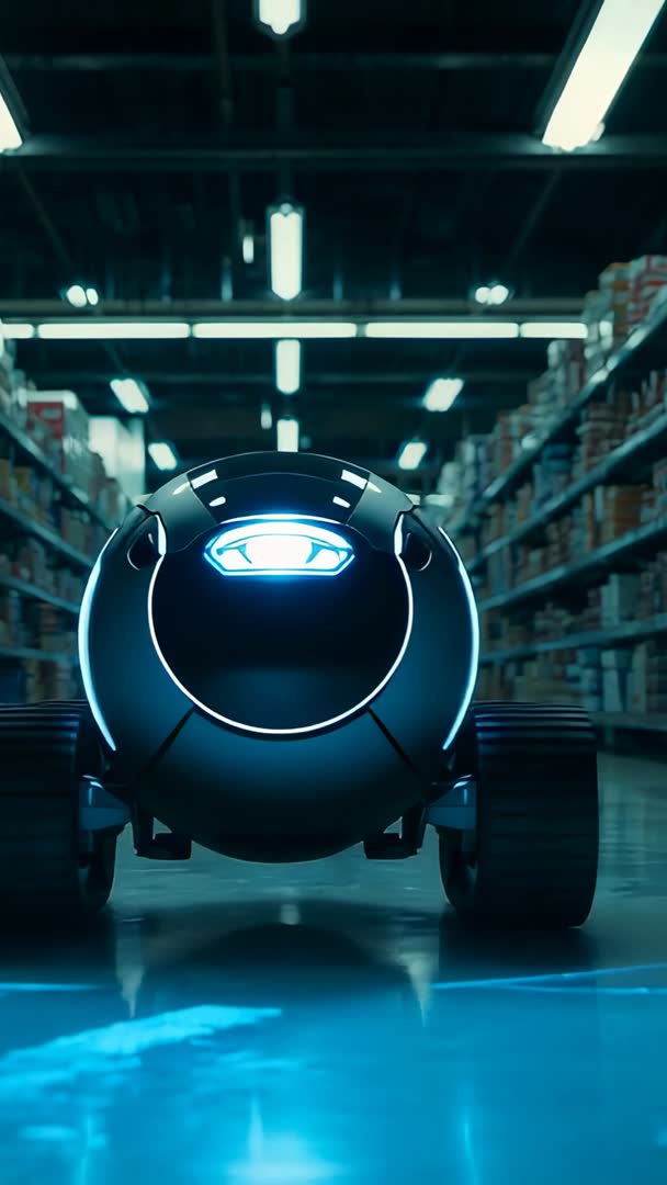 AI Generated Image. Video showing autonomous spherical robot rolling down warehouse aisle, scanning shelves with pulsing cyan LED and reflecting glow on polished floor. Low-angle frontal composition emphasizing rugged treads, sleek shell, and sensor array while overhead industrial lights recede into background. Lighting creating cinematic contrast and cool color palette, suggesting high-tech efficiency and precision. Use as B-roll for corporate videos, product demos, tech blogs, investor pitches, social media reels, vertical ad creatives, training modules, and trade show presentations. Editing suggestions: crop for 9:16 vertical format, add lower-third text and logo, overlay animated UI elements showing inventory data, apply teal-cyan color grade, add subtle motion blur and electronic sound design, create loopable short clip for reels. Suitable for audiences including logistics managers, warehouse operators, robotics startups, supply chain publications, tech marketers, and investors looking for futuristic automation visuals.