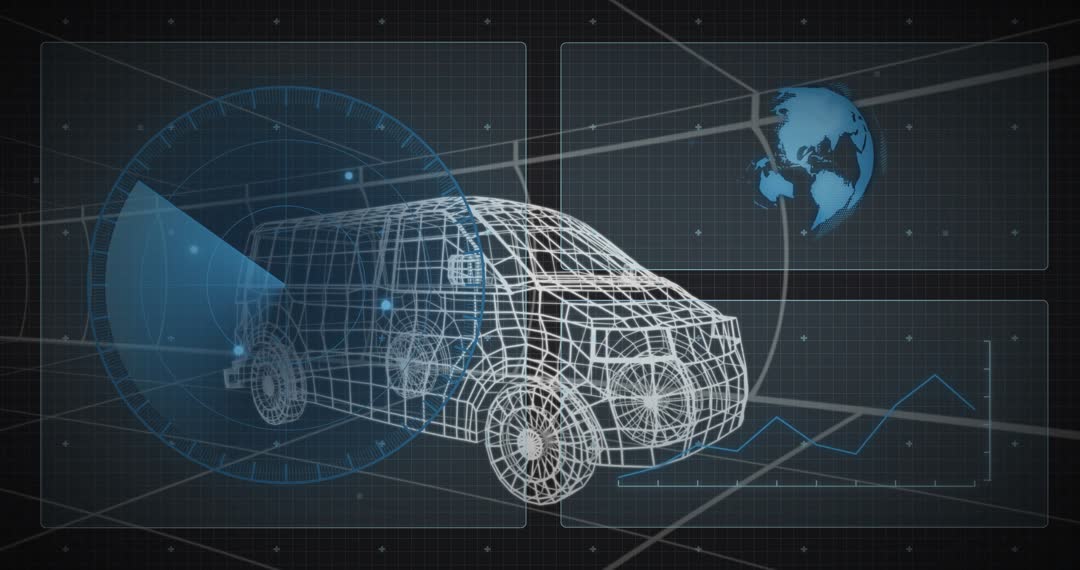 Showing wireframe van undergoing radar scan with blue HUD graphics, telemetry charts, and globe overlay. Combining 3D modeling, sensor visualization, and data analytics for demonstrating autonomous driving systems, sensor fusion testing, fleet telematics, vehicle diagnostics. Useful for video backgrounds, technology presentations, product demos, training modules, marketing for automotive suppliers, startup pitch decks. Suitable for illustrating LiDAR and radar detection, collision avoidance, path planning, sensor calibration, real-time telemetry dashboards. Delivering futuristic tech aesthetic with high contrast grid, glowing accents, global connectivity motif. Providing easy integration into corporate videos, explainer animations, website hero banners, trade show reels, e-learning content and R&D concept demonstrations.