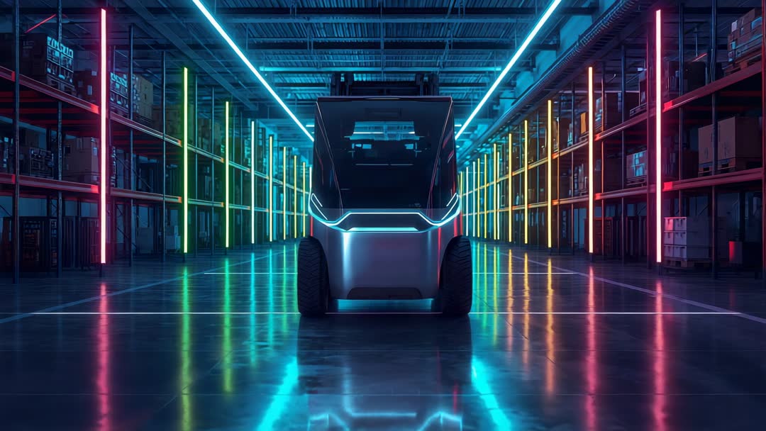 AI Generated Image. Featuring autonomous delivery robot rolling down wide warehouse aisle lined with tall storage racks and vertical neon LED columns, reflecting on glossy polished floor. Robot facing camera with LED light strip activating and signaling navigation through inventory lanes. Scene conveying futuristic automated logistics, demonstrating efficient inventory flow, real-time robotics control, and last-mile indoor mobility. Ideal for tech marketing, startup pitch videos, logistics and supply chain presentations, corporate website hero loops, product demos, training materials, and social media promos. Visual elements highlighting neon lighting, symmetrical composition, reflective floor, cinematic perspective for high-impact branding and editorial storytelling.
