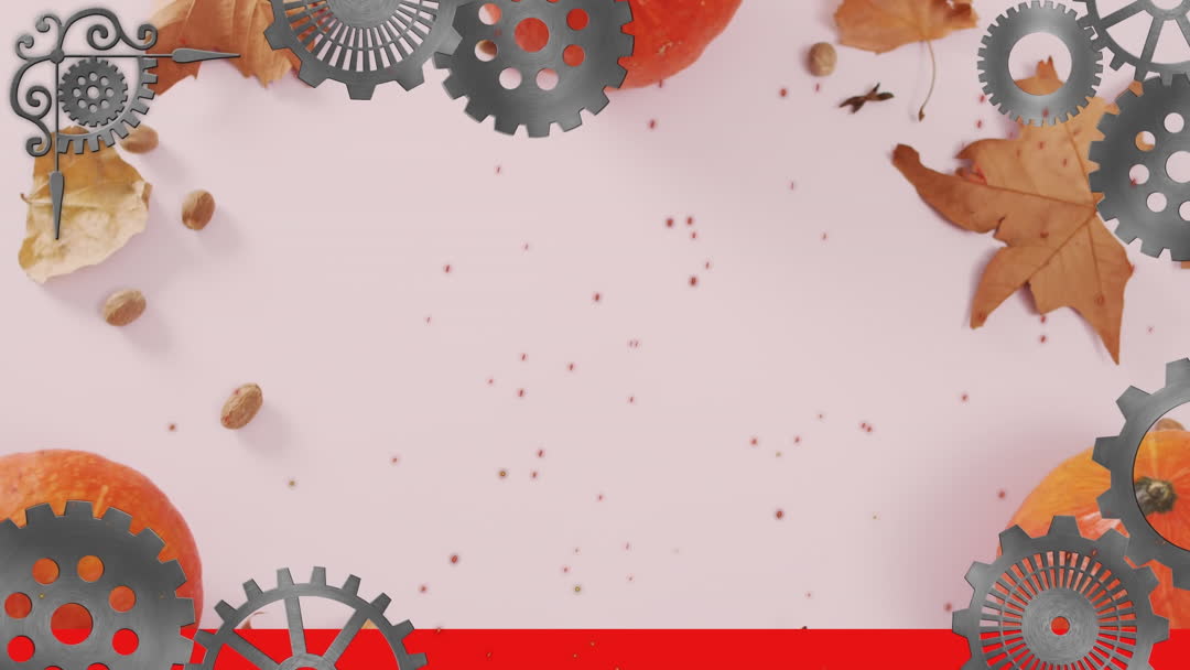 An animated design depicting moving mechanical gears on a festive background with pumpkins, acorns, and fall leaves. Ideal for use in Halloween or autumn themed promotions, greeting cards, or social media posts, bringing together a blend of festive and mechanical elements for visual interest.