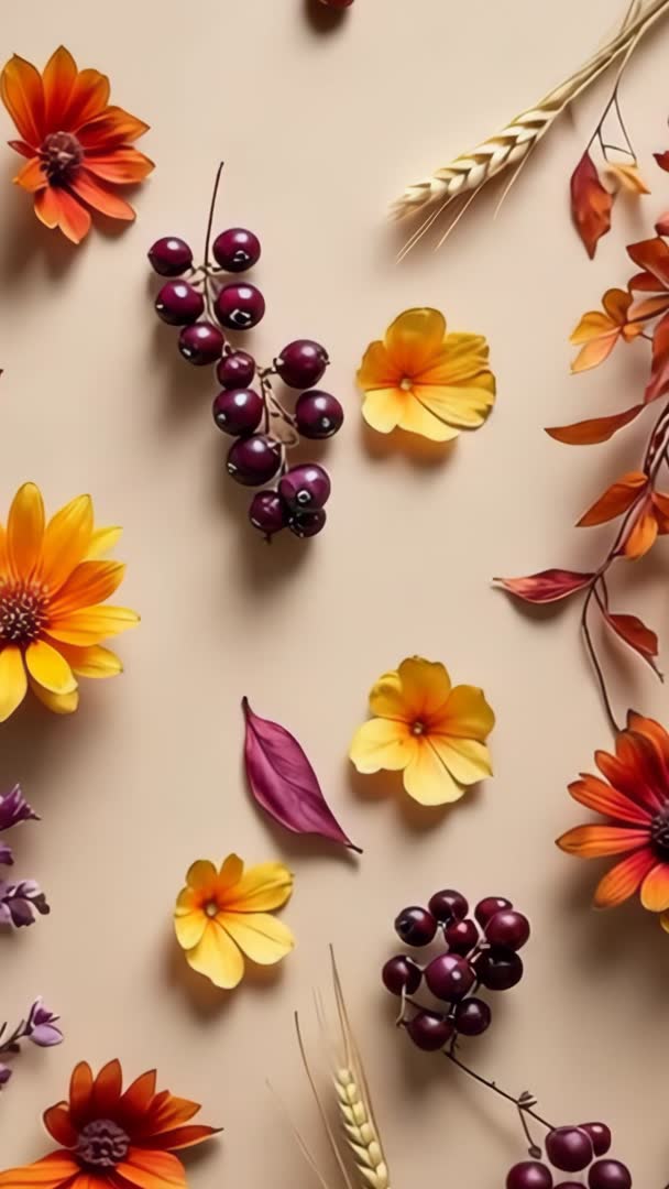 AI Generated Image. Sliding botanical elements arranging into neat composition on warm beige surface, featuring yellow-orange daisies, burgundy berries, wheat stalks and autumn leaves. Close-up vertical loop capturing gentle motion and soft shadows for elegant seasonal atmosphere. Creating smooth loop for vertical platforms, ideal for Instagram Reels, TikTok, Stories, mobile ads and website hero banners. Useful for seasonal marketing, restaurant menu backdrops, blog headers, invitation animations, greeting card designs and packaging. Color palette emphasizing warm orange, yellow and burgundy tones for autumn branding and product promotions.
