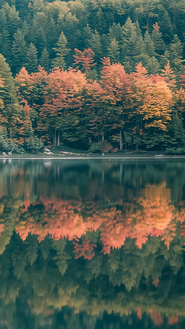 AI Generated Image. Vertical 9:16 footage showing autumn trees reflecting on calm lake while gentle breeze rippling water surface. Warm fall foliage and deep evergreen canopy creating strong color contrast and mirror-like reflection across water. Suited for Instagram Reels, TikTok, Stories, vertical ads, mobile wallpapers, and ambient background loops. Serving travel promotions, seasonal marketing, wellness apps, mood-setting B-roll, and environmental storytelling. Adding soft ambient music or solo piano for enhancing tranquil mood. Applying gentle crop or slow zoom for creating seamless loop; placing text or logo in upper third over treeline or lower third over reflection area for preserving readability. Boosting orange and green color tones for improving visual impact on social feeds. Offering loop-ready clip for seamless repeats and short-form vertical narratives.