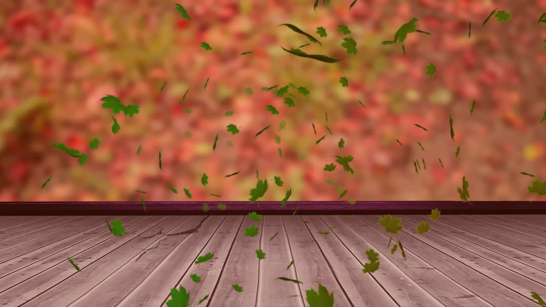 Colorful animation depicting vibrant autumn leaves falling gracefully onto a wooden deck creates a serene and natural ambiance. Perfect for promoting seasonal sales, decorating presentations on autumn themes, or adding a dynamic background in digital designs related to nature, tranquility, or seasonal transitions.