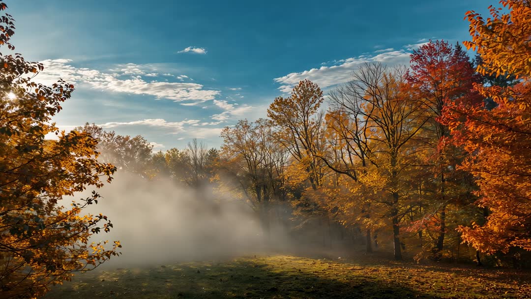 AI Generated Image. Video clip showing morning mist rising through autumn forest, sunlight piercing golden and red leaves, and soft clouds drifting across clear blue sky. Camera panning slowly from left sun flare into fog bank, leaves glowing, shadows stretching across thinning meadow. Mood evoking calm, warmth, seasonal transition, and early dawn atmosphere. Color palette featuring warm gold, orange, crimson contrasted with cool blue sky and pale mist. Suitable for nature documentary opener, seasonal marketing campaigns, travel promotion reels, wellness and meditation videos, social media reels, website hero background, desktop wallpaper, print poster or calendar art. Editing suggestions: use slow crossfade, gentle music bed, subtle color grading to enhance warm tones, optional slow-motion for fog movement.