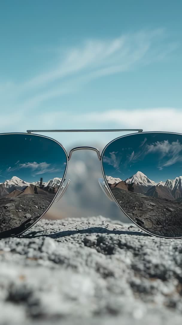 AI Generated Image. Vertical video capturing aviator sunglasses reflecting snowy alpine peaks while focus shifting from rocky foreground to distant mountain ridge. Mirrored lenses reflecting crisp blue sky and wispy clouds, creating cinematic depth and layered composition. Close-up foreground of sunglasses resting on rocky ground, providing tactile texture and strong foreground interest. Scene conveying adventure, exploration, outdoor lifestyle, travel mood, and high-altitude freedom. Usage ideas: Ideal for hero background on travel websites, social media reels, vertical ads, and adventure tourism campaigns. Pairing with bold typography for title cards or overlaying inspirational travel quotes. Applying slow motion or subtle speed ramps to emphasize focus shift and create cinematic reveal. Using as product showcase for sunglasses, hiking gear, mountain resorts, outdoor apparel, or eyewear advertising. Delivering high-impact vertical clip for mobile-first campaigns on Instagram Reels, TikTok, or Stories.