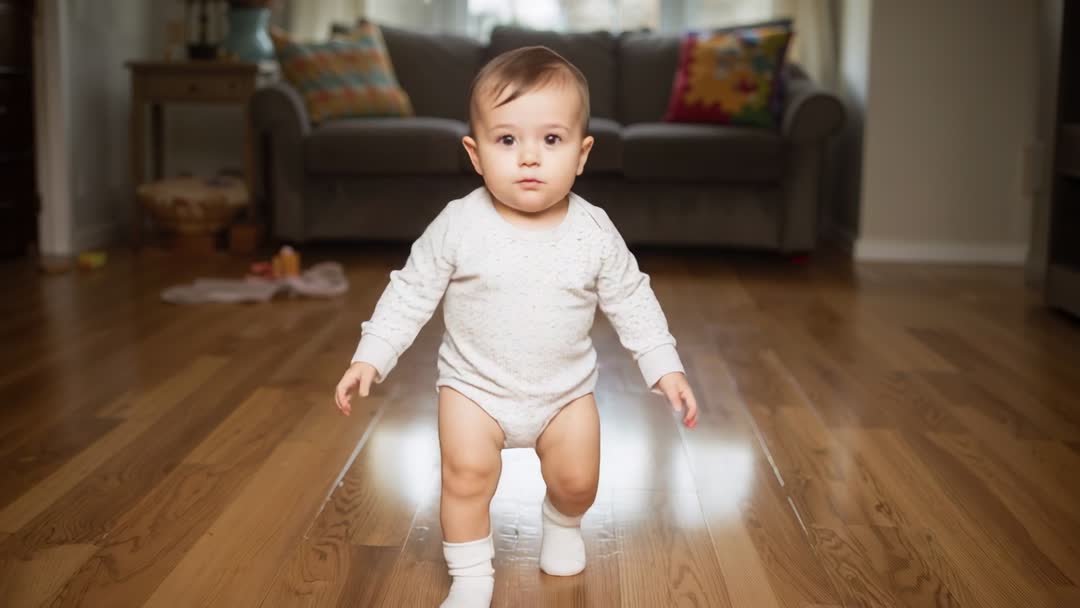 AI Generated Image. Clip showing baby taking first steps across hardwood floor while approaching camera in cozy living room. Baby wearing light onesie and white socks, balancing with arms slightly outstretched and keeping steady gaze toward camera. Soft natural light reflecting on polished wood floor, colorful sofa and scattered toys blurring in background to suggest home life. Footage conveying milestone moment, toddler development, family bonding and home safety themes. Consider using slow motion, close-up crop, warm color grade and gentle acoustic music for emotional storytelling. Suited for parenting blog hero clips, baby product commercials, pediatric clinic waiting room displays, early childhood development articles, social media reels, family vlog B-roll, interior design projects focusing on flooring, safety campaign for childproofing or educational material about motor skill milestones.
