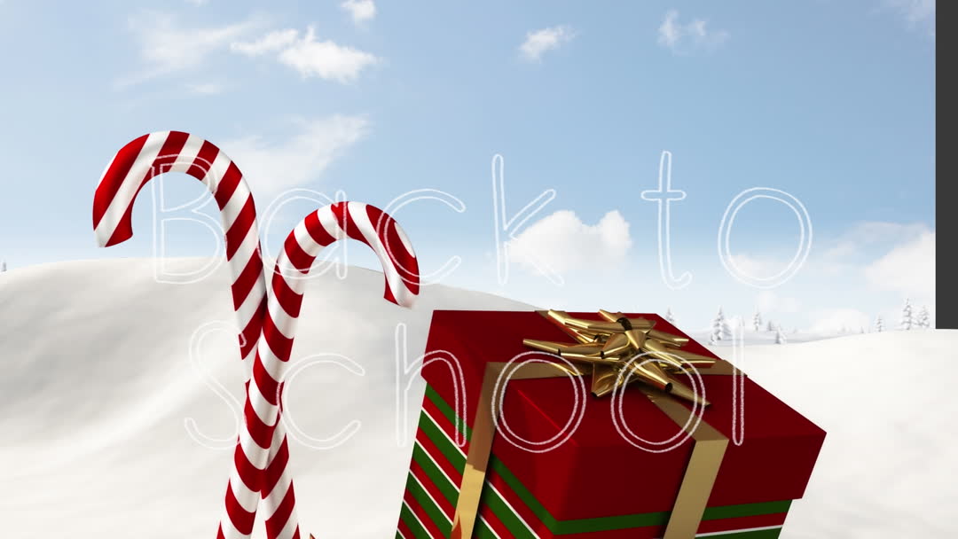 Illustration blends 'Back to School' text theme with a winter holiday. Candy canes and gift box set in snowy landscape add festive touch. Useful for seasonal educational promotions, holiday-themed school campaigns, or festive announcements.