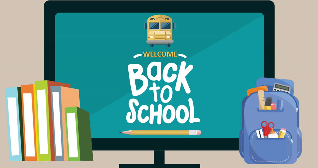 A colorful digital representation of back to school announcement on computer monitor featuring related icons such as books and school bag. It is suitable for use in online educational content, presentations, or as a visual aid for teachers and tutors welcoming students back to school.