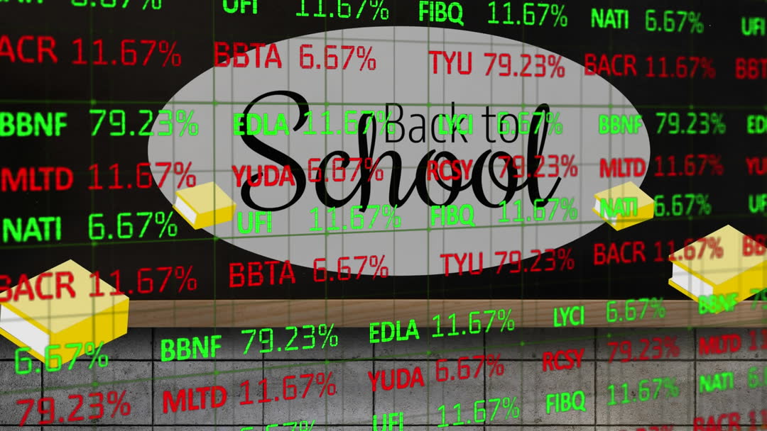 Animation showcases blend of back to school theme with digital interface of stock market data. Display emphasizes intersection of modern education and finance, ideal for concepts related to business education, financial literacy or technological advancements in schooling. Suitable for educational blogs, financial education programs, and tech-integrated learning platforms.
