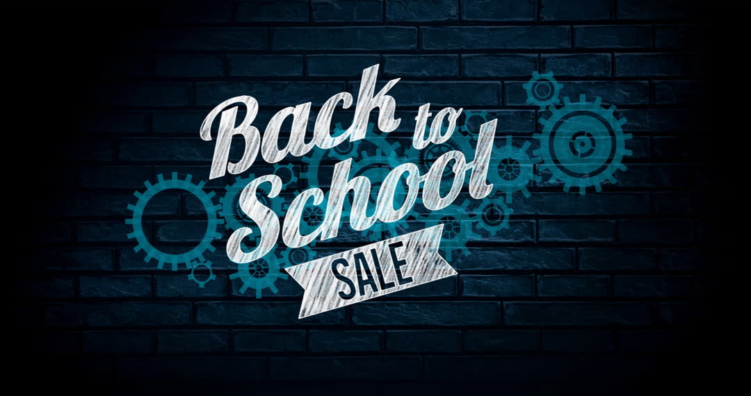 Dynamic design portrays back to school sale message with chalkboard font over gear motifs. Ideal for promoting retail events in educational supplies or school-focused products. Perfect for use in digital marketing campaigns and website banners to catch the eye of consumers preparing for the school season.