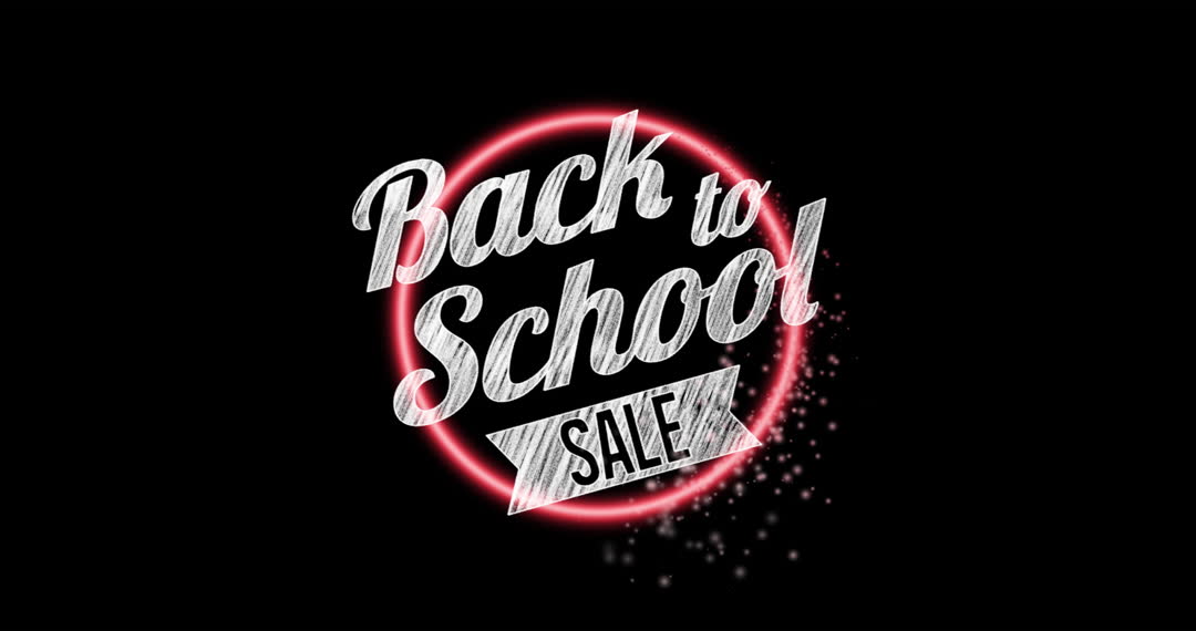 Dynamic neon circle and animated text create engaging visual perfect for promoting back to school sales. Ideal for marketing campaigns, online store banners, and social media advertisements to attract customers' attention during the shopping period. Easily integrated into digital presentations or company promotional materials.
