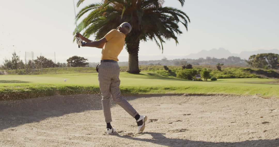 African American man dressed in smart casual golf attire swings a shot out of a sand trap on a picturesque golf course. Clear skies and lush green surroundings underline the ideal conditions for golfing. Perfect for illustrating themes around leisure activities, sport and discipline, African American athletes, or promotional content for golf-related events and equipment.