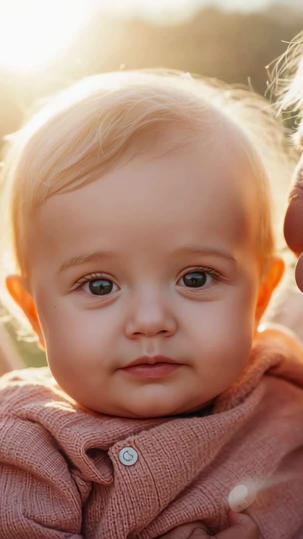 AI Generated Video. Footage showing infant smiling and shifting expression while being held facing camera outdoors during golden hour. Backlit halo around hair creating warm, soft glow and gentle lens flare. Close-up vertical video optimizing for mobile platforms and social media reels. Serving parenting blogs, baby product ads, family marketing, daycare promotions, pediatric healthcare content. Scene working for emotional storytelling, warmth and connection messaging. Color palette featuring warm gold tones and soft skin tones, knit sweater adding tactile texture. Deliverable vertical 9:16 clip suiting Instagram Reels, TikTok, stories, mobile ads.