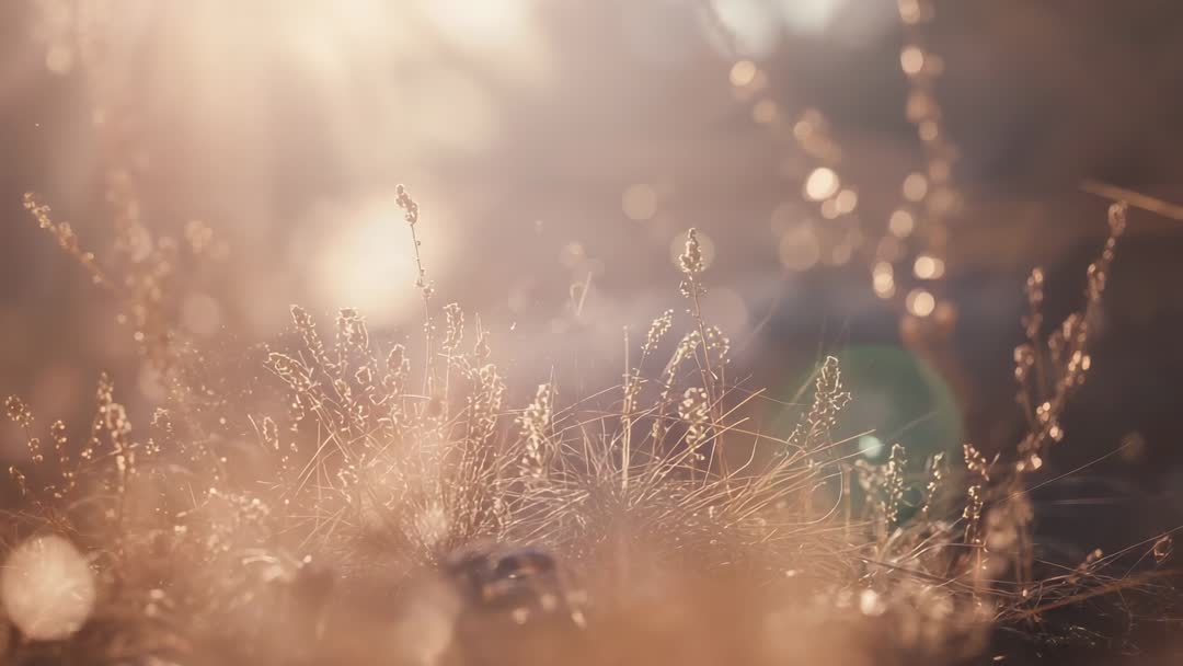 AI Generated Image. Dreamy backlit meadow footage capturing delicate grass seedheads swaying in warm golden hour sunlight, with sparkling bokeh and gentle lens flare creating glowing highlights. Shallow depth of field creating soft focus foreground and background, emphasizing texture and subtle movement. Offering cinematic mood suitable for slow-motion edits, title sequences, and calming b-roll. Working well for mindfulness and meditation apps, wellness and spa commercials, seasonal advertising, wedding montages, website hero backgrounds, social media reels, and broadcast lower thirds. Pairing with ambient music, soft narration, or nature sound design for relaxing atmospheres. Delivering flexible color palette for grading, allowing speed ramping and seamless looping for extended playback and overlays.