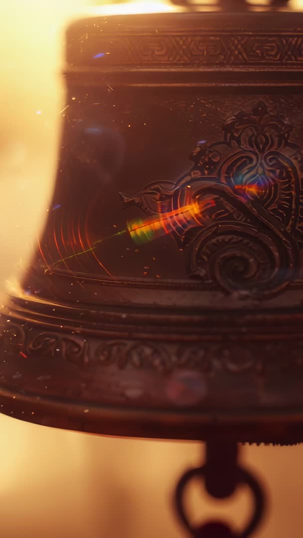 AI Generated Video. Vertical clip capturing backlit ornate temple bell glowing in warm golden sunlight. Fine dust particles drifting through air and catching prism lens flare, creating cinematic bokeh and colorful streaks. Close-up revealing embossed relief patterns and clapper silhouette, with soft motion blur and warm color grading. Serving spiritual and cultural storytelling, travel and heritage content, meditation and mindfulness footage, ceremonial and festival promos, luxury and antique product campaigns, film and commercial openers. Editing suggestions: applying slow-motion playback, adding warm LUT, applying soft vignette, overlaying ambient bell sound for immersive atmosphere. Trimming to 10-30 seconds for social reels and looping for background ambience, or extending for contemplative sequence in longer edits.