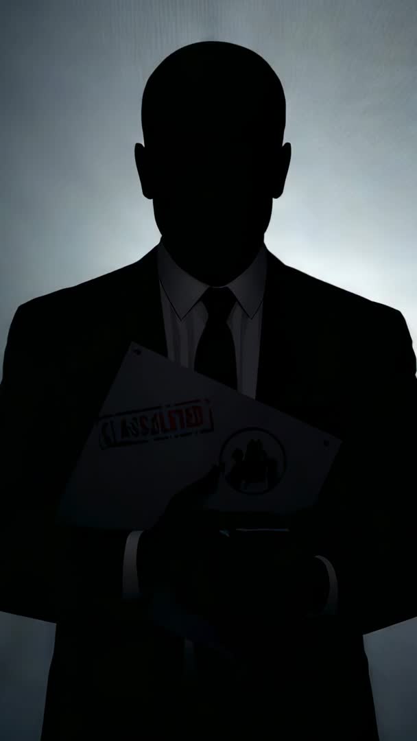AI Generated Video. Featuring backlit silhouette of suited executive holding stamped classified folder while checking smartphone in vertical studio video. Lighting creating dramatic halo behind silhouette and obscuring facial features to convey anonymity and secrecy. Camera focusing on folder stamp and smartphone interaction to build tension and narrative. Providing strong visual for corporate security topics, data privacy campaigns, investigative journalism, espionage or thriller promos, news packages about leaks, and training videos on handling confidential documents. Working well as opening clip, social media vertical ad, website hero video, or interstitial for podcasts and webinars. Offering neutral composition and high contrast for easy overlay of text, logos, or lower-thirds; color grading and simple edits enhancing mood for darker, suspenseful storytelling.