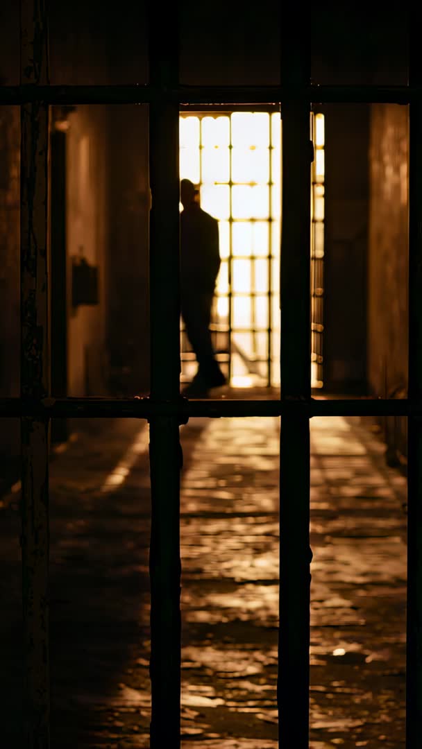 AI Generated Video. Showing backlit silhouette walking through barred corridor toward bright doorway in vertical format. Foreground bars creating strong vertical lines and layered shadow. Golden light pouring through grid door, casting textured reflections on worn floor. Man wearing hat pausing near panel, silhouette conveying mystery and isolation. Composition working well for cinematic trailers, crime drama intros, thriller promos, or social media reels needing moody atmosphere. Use for background footage in title sequences, documentary segments about incarceration or security, advertising for escape room experiences, music video intros, and podcast cover clips. Color grading suggestions: boosting warm tones and contrast to emphasize backlight while preserving deep shadows. Framing recommendations: maintaining vertical composition for mobile-first platforms and allowing space above figure for text overlays and lower third graphics.