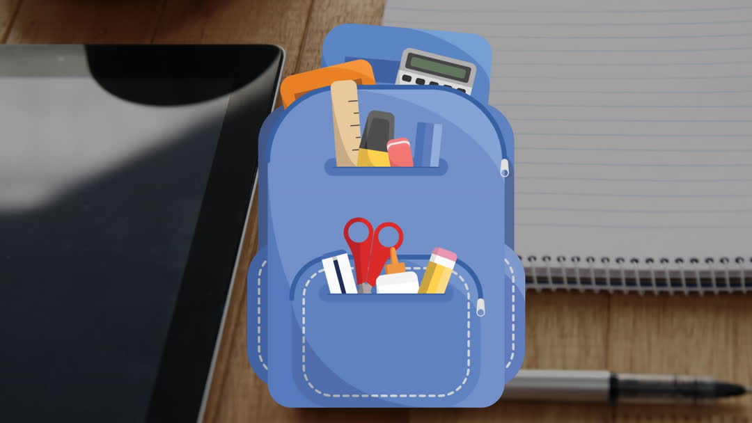 Animation overlay of illustrative backpack with school essentials on a desk. Shows organized learning and preparation for students. Useful for education, back-to-school promotions, or academic content within digital media emphasizing the blend of technology and study materials.