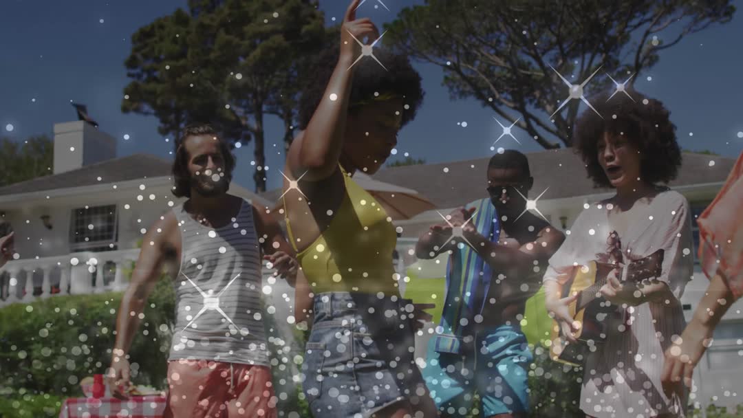 Showing group of friends dancing and singing on backyard lawn during spontaneous ukulele jam, with sparkling star phone overlay creating festive, dreamy vibe. Capturing candid energy, natural sunlight, and lively group interaction for authentic lifestyle storytelling. Working well for social media short clips, Instagram Reels, TikTok, and YouTube Shorts promoting summer parties, outdoor events, music playlists, and hospitality campaigns. Offering easy edits for headline overlays, text callouts, or looped background b-roll. Suggest keeping sparkle overlay for stylized social posts or removing overlay for clean commercial footage. Delivering upbeat, friendly mood for event invites, brand activations, travel lifestyle features, and entertainment promos.