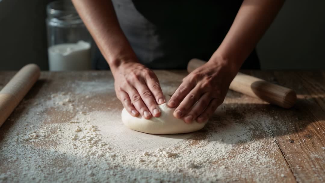 AI Generated Image. Showing close-up of hands kneading and shaping dough on floured wooden table, with rolling pins and jar of flour framing scene. Featuring warm natural light, rustic wooden texture, and tactile motion ideal for conveying artisan breadmaking process. Working well as B-roll footage for cooking tutorial, recipe video, bakery branding, social media reel, or cookbook demo. Suggesting use as intro shot, cutaway, step-by-step sequence, or hero moment for promoting artisan bakery or small business. Delivering homey, handcrafted mood suitable for food blogs, culinary classes, product packaging, and advertising. Providing versatile clip for editorial, commercial, or instructional projects, compatible with horizontal and square crops and slow-motion emphasis for added detail.