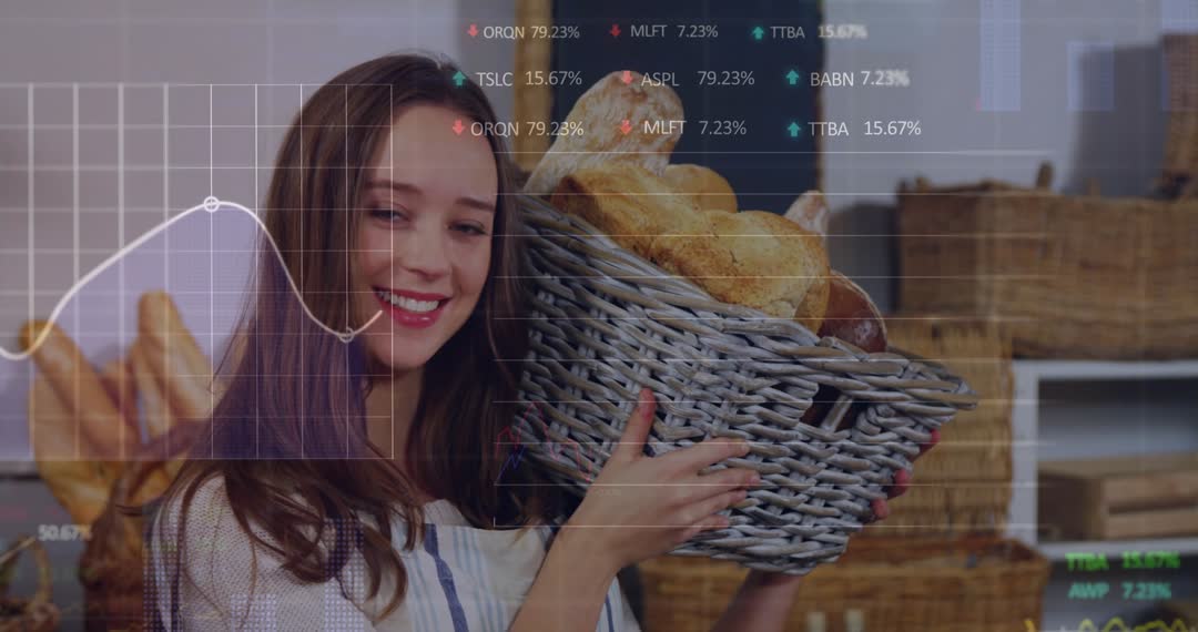 Video capturing bakery clerk holding basket of fresh bread as digital sales chart overlays suggest business growth and retail success. Overlay visualizes data-driven progress that appeals to bakery suppliers, retailers, commercials about business growth, market trends in artisan foods.