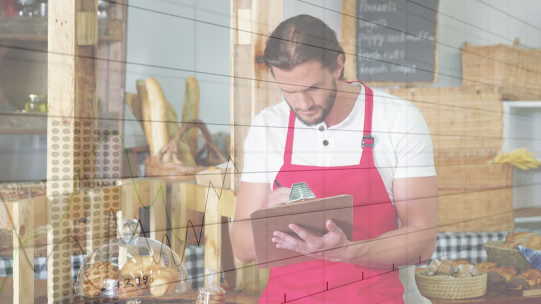 Image shows bakery setting with a man using clipboard, overlapped with business analysis chart visuals, depicting a focus on business management strategies. Useful for illustrating efficient retail management, operational analytics, and food industry productivity techniques in advertising, marketing, and professional presentations.