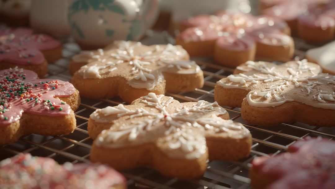 - Baking Sugar Cookies with Intricate Decorations on Wire Rack